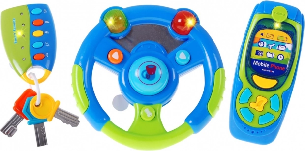 Il set interattivo per piccoli include un telefono mobile con vari pulsanti che portano suoni e melodie allegre. Il volante è dotato di un display interattivo che si attiva premendo i pulsanti, inclusi suoni come il clacson, l'accensione dell'auto e le frecce. Le chiavi con telecomando offrono cinque funzioni per ancora più divertimento.