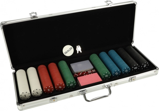 Il set include fiches, carte e dadi per diverse varianti di gioco. La valigetta d'argento assicura la conservazione sicura dei componenti e un facile trasporto.