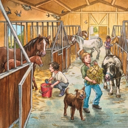 I bambini comporranno una scena di cura dei cavalli, la vita in scuderia e una gioiosa passeggiata nella natura – sempre 49 pezzi e colori vivaci.