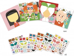- 16 fogli con modelli di volti, 240 adesivi removibili (occhi, nasi, bocche, occhiali, baffi, orecchini ecc.)