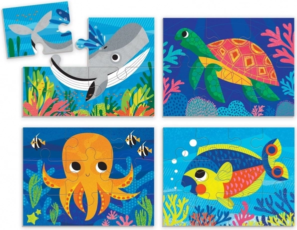 Questo creativo set 4 in 1 presenta quattro puzzle separati con adorabili temi del mondo sottomarino – balena, tartaruga, piovra e pesciolino. I pezzi sono realizzati in cartone riciclato con finitura opaca per colori fedeli e un tocco piacevole. Ogni puzzle ha un numero diverso di pezzi (4, 6, 9, 12), così i bambini possono avanzare passo dopo passo sviluppando motricità fine, pazienza e pensiero logico.