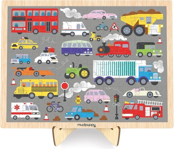 Scopri il divertimento e l’apprendimento con il puzzle in legno MUDPUPPY a tema mezzi di trasporto. Il set include 100 robusti pezzi in legno con splendide illustrazioni di auto, camion, autobus e altro, e in più un pratico supporto in legno per esporre l’immagine finita come decorazione.