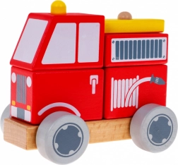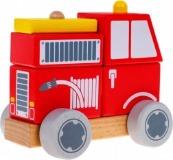 La base con due pioli e i pezzi colorati permettono ai bambini di assemblare facilmente il proprio camioncino dei pompieri e allenare la motricità fine.