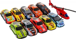 Il set include 10 macchinine, un elicottero e adesivi decorativi per maggiore divertimento e creatività.