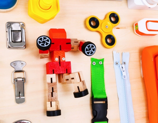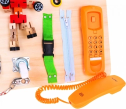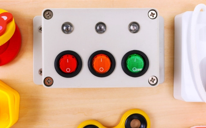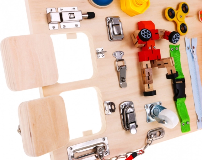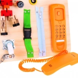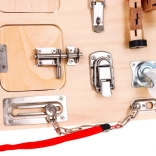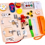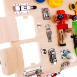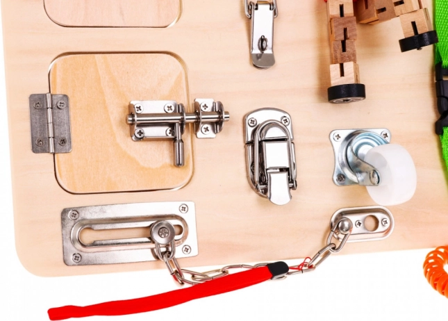 La lavagna contiene numerosi elementi interattivi come serrature, interruttori e meccanismi di ritorno, che aiutano a migliorare la motricità fine e ad apprendere le relazioni di causa ed effetto.