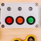 La lavagna multifunzionale in legno è progettata per offrire ai bambini esperienze sensoriali e manipolative. Contiene elementi che un bambino incontra quotidianamente nella vita e aiuta a capire come funzionano. Include elementi sonori (campanello) e luminosi (interruttori con diodi), aumentando il suo valore interattivo. La lavagna è alimentata da 2 batterie AA, non incluse nella confezione.