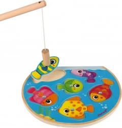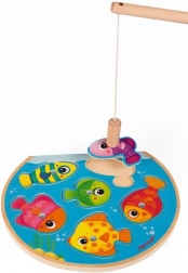 Divertente puzzle magnetico in legno per piccoli pescatori. Con la canna da pesca magnetica i bambini pescano e rimettono i pezzi al posto giusto. Include 6 pesciolini colorati e 1 canna da pesca, sviluppa la motricità fine, la coordinazione occhio–mano e il riconoscimento di colori e forme. Adatto a partire da 12 mesi.
