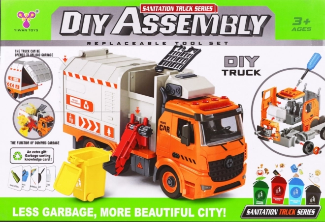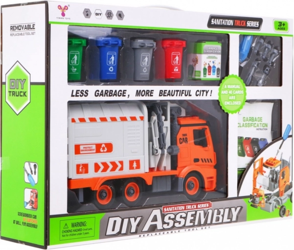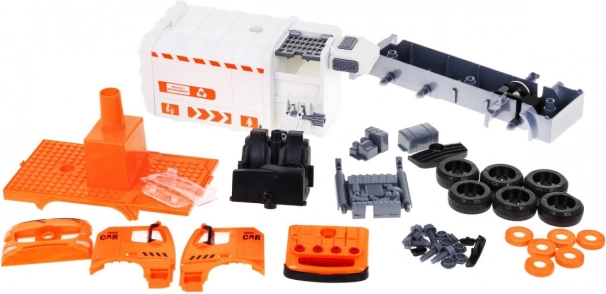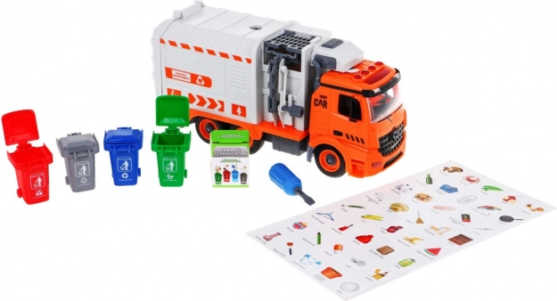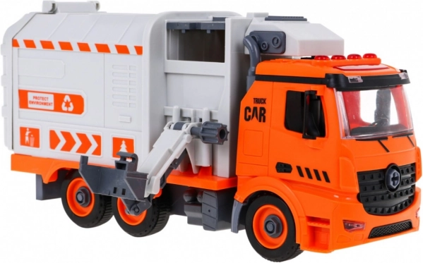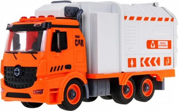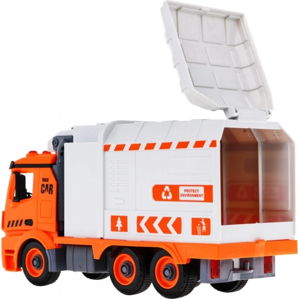 Con un cacciavite a punte intercambiabili, il bambino può smontare e rimontare il veicolo. Il braccio laterale solleva e svuota i bidoni proprio come su un vero camion della nettezza urbana.