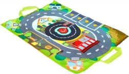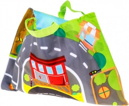 Il tappetino con strade, casette e natura si piega grazie al velcro in una pratica borsa con manici. Facile da riporre e da portare ovunque.