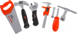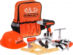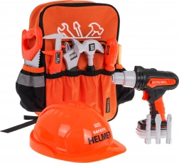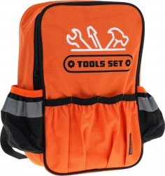 Lo zaino è realizzato in tessuto resistente, dispone di scomparto principale con cerniera, tasche laterali e frontali e spallacci regolabili per un trasporto confortevole. Il set include sega, martello, cacciavite con bit, chiavi, viti con dadi e piastrine di montaggio, il tutto in una costruzione leggera, durevole e adatta ai bambini.