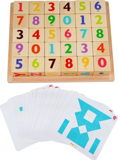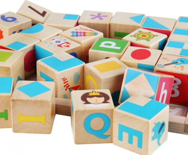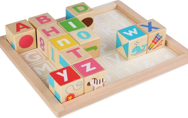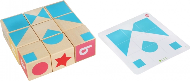 Il set include anche una base con cornice con l'alfabeto e 15 carte fronte-retro con modelli speciali. I bambini possono abbinare i cubetti ai posti giusti o creare figure secondo il modello che ricorda un tangram. Realizzato in legno di qualità e dipinto con colori atossici, assicura un gioco sicuro e divertente.