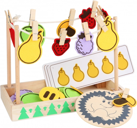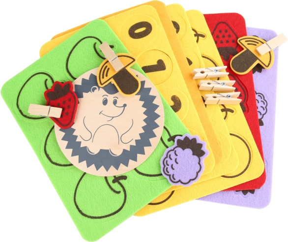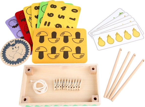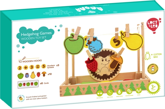 Il set include una base in legno, un piccolo riccio, carte divertenti e tappetini colorati in feltro - ideali anche per giocare insieme a più bambini. Per una facile conservazione, tutto è confezionato in un pratico sacchetto di cotone.