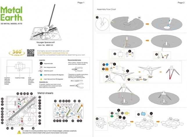 Rimuovi i singoli pezzi dai fogli metallici; se necessario, usa piccole tronchesi (non incluse). I pezzi si collegano tra loro tramite incastri formati da una linguetta e un foro. Piega la linguetta con piccole pinze a becchi sottili (non incluse) e unisci progressivamente tutti gli incastri fino a ottenere un capolavoro estremamente realistico!