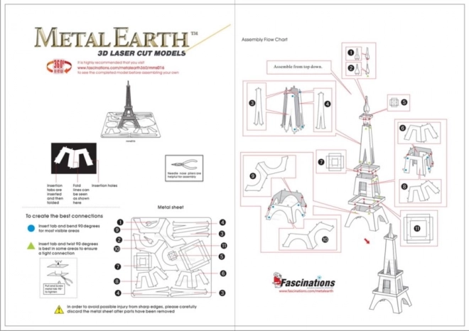 Rimuovete i singoli pezzi dalle lastre metalliche; se necessario, utilizzate una piccola tronchesina (non inclusa). I pezzi si collegano tra loro tramite incastri formati da una linguetta e un foro. Piegate la linguetta con una piccola pinza a becchi fini (non inclusa) e unite progressivamente tutti gli incastri fino a creare un capolavoro molto realistico!