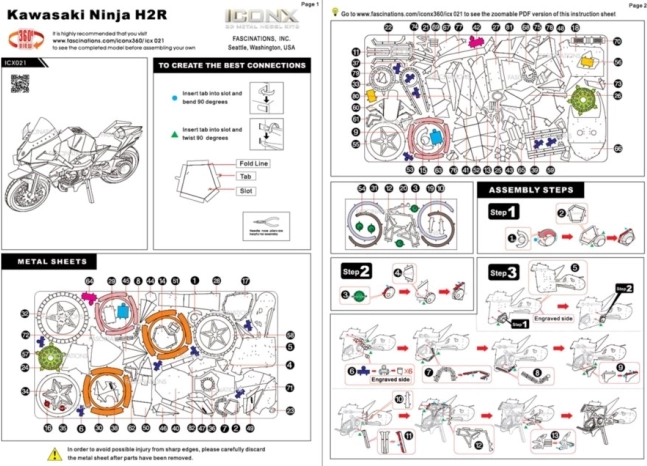 Rimuovi i singoli pezzi dai fogli metallici; se necessario usa una piccola tronchesina (non inclusa). I pezzi si collegano tra loro tramite incastri formati da linguette e fori. Piega la linguetta con piccole pinze sottili (non incluse) e unisci gradualmente tutti gli incastri fino a ottenere un capolavoro estremamente realistico!