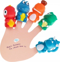 Cinque burattini di dinosauro colorati in morbida gomma si adattano perfettamente alle dita dei bambini. Sono impermeabili, privi di spigoli vivi e favoriscono la motricità fine e il gioco creativo.