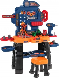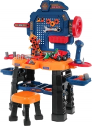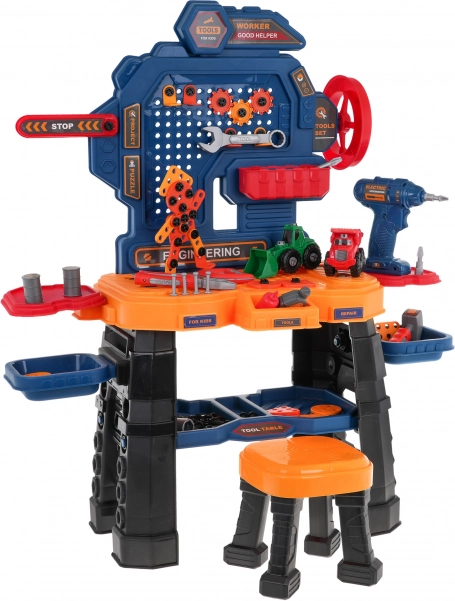 Questo colorato set da officina trasforma la cameretta in una vera mini officina. Il robusto banco da lavoro con ripiani e organizer è affiancato da un comodo sgabello e da un trapano avvitatore a batteria (2× AA, non incluse). I bambini possono avvitare, forare e assemblare progetti propri, inclusi due veicoli da cantiere: pala caricatrice e dumper.