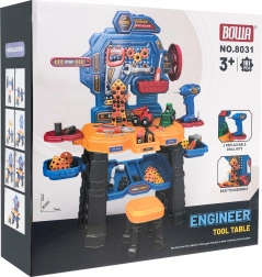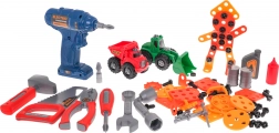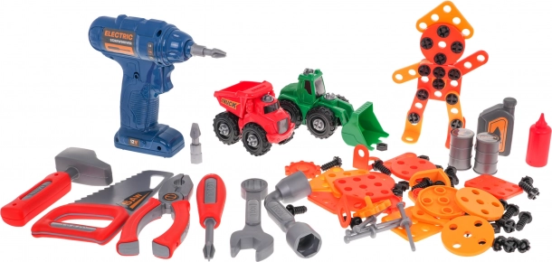 Inclusa un’ampia dotazione di utensili: trapano con bit, sega, martelletto, cacciavite, chiavi, pinze, decine di viti, tasselli e rondelle e ingranaggi per un primo approccio alla meccanica. Grazie alla grande quantità di pezzi e pannelli sagomati, i bambini esercitano pazienza, logica e coordinazione.