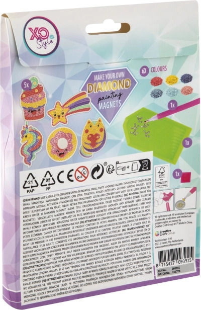 Questo set creativo unisce la popolare tecnica del “diamond painting” a una decorazione pratica per la casa. Applicando progressivamente i piccoli diamantini seguendo lo schema, in poco tempo nasceranno magneti scintillanti con motivi allegri, capaci di illuminare ogni luogo in cui li applicherete.