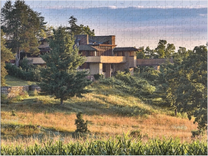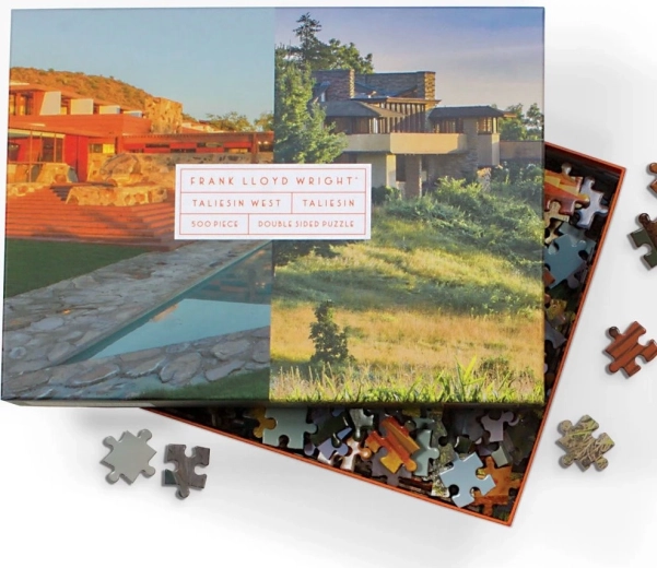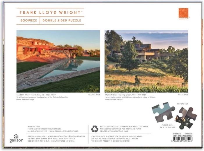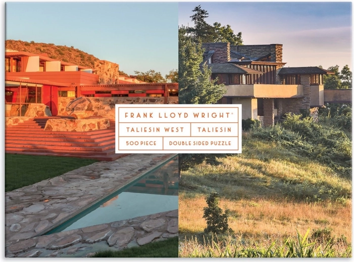 Scopri due capolavori in un'unica confezione. Questo puzzle bifacciale propone suggestive immagini delle iconiche strutture Taliesin e Taliesin West, legate al nome del visionario architetto FRANK LLOYD WRIGHT. Grazie alle diverse finiture superficiali – lucida da un lato e opaca dall'altro – il montaggio è chiaro, divertente e adatto a un ampio pubblico di appassionati di puzzle.