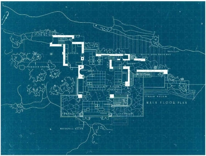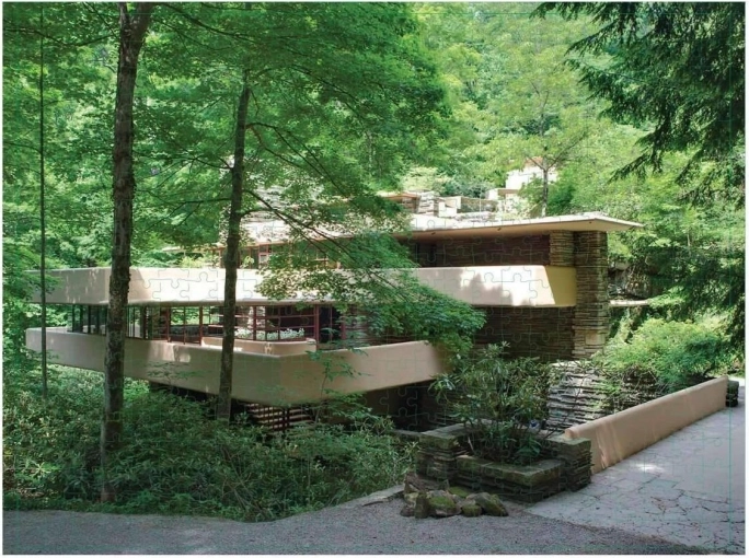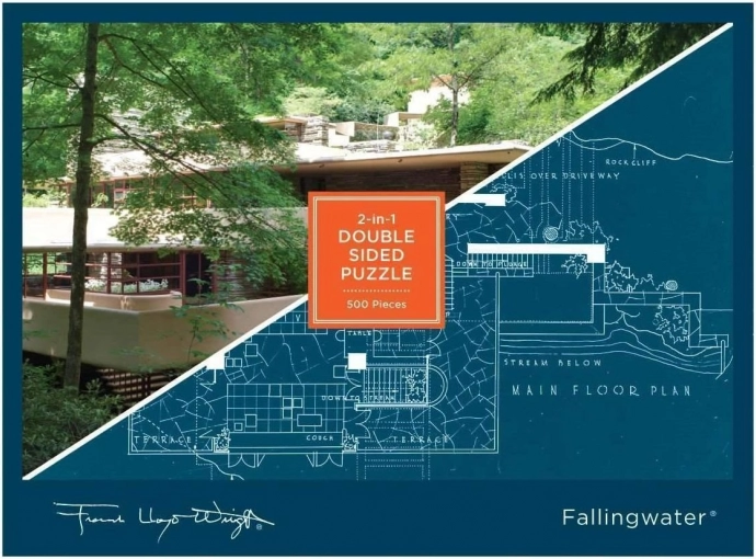 Il puzzle presenta su un lato il motivo di una delle case più famose, la casa sulla cascata, ovvero Fallingwater, e sull’altro il disegno del progetto architettonico dell’edificio. Le tessere hanno due finiture superficiali, lucida e opaca, per facilitare la distinzione dei due motivi. Dimensioni del puzzle assemblato: circa 61 × 46 cm