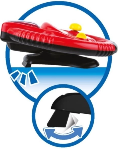 L’auto con luci lampeggianti si muove sullo schermo mobile. Grazie al clacson il bambino può suonare e avvisare i conducenti indisciplinati. Il volante ha un supporto regolabile.