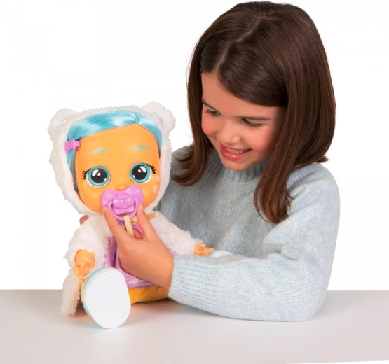 Kristal piange vere lacrime e, senza il ciuccio, emette suoni che imitano l’esperienza di prendersi cura di un bebè.