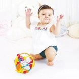 Al centro della sfera ruota una spirale con palline colorate che, muovendosi, producono un piacevole tintinnio e attirano l’attenzione del neonato.