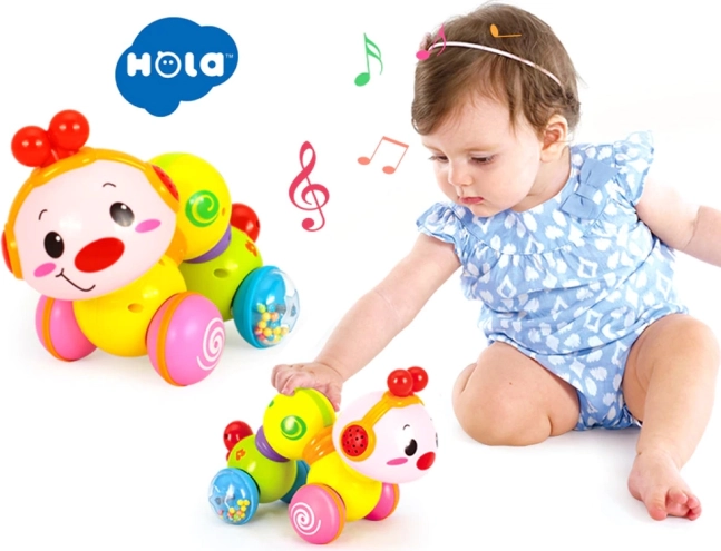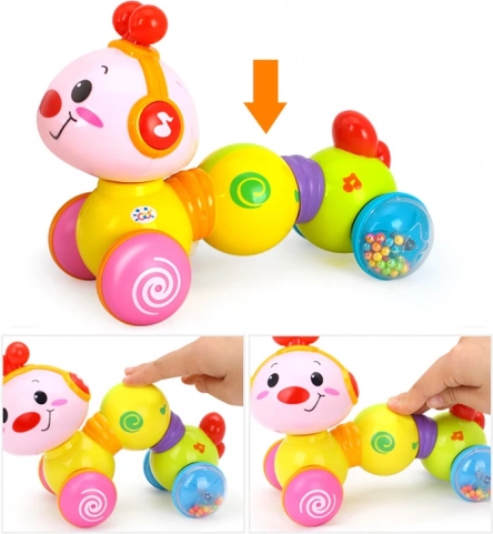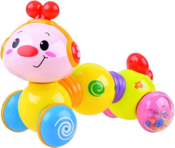 Un allegro bruco interattivo su ruote, che parte quando si preme la schiena, si illumina e riproduce melodie. Favorisce il gattonare, lo sviluppo della motricità e l'apprendimento di causa-effetto già dai 6 mesi.