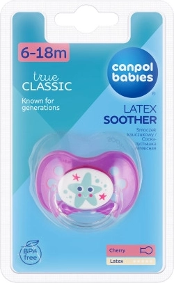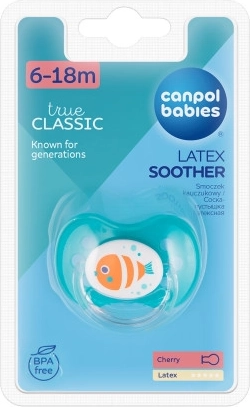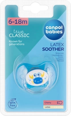 Il succhietto della collezione LOVE&SEA a forma di ciliegia è realizzato in caucciù naturale, di colore giallastro, leggermente opaco e con il caratteristico sapore di gomma. Inoltre è decorato con adorabili animaletti dell’amata collezione LOVE&SEA. Il succhietto è privo di BPA. Vantaggi dei succhietti Canpol babies: si sfiatano bene, potete verificarlo facilmente premendo la tettarella (non sottovalutate questa caratteristica: una scarsa sfiatatura del succhietto porta a deformazioni del palato e dell’occlusione del bambino); i fori di ventilazione nello scudo del succhietto permettono la libera circolazione dell’aria, il drenaggio della saliva e prevengono così irritazioni della pelle intorno alla bocca; l’anello di sicurezza del succhietto è ben saldo, facilita la presa comoda per il bambino e aiuta i genitori ad agganciare clip o catenella; i succhietti sono disponibili in colori allegri e design originali. Istruzioni d’uso: prima del primo utilizzo, per motivi igienici sterilizzare il succhietto in acqua bollente per circa 5 minuti. Dopo il raffreddamento, spremere l’acqua residua dal succhietto. Prima di ogni utilizzo lavare accuratamente il succhietto in acqua tiepida. Non usare detergenti antibatterici o chimici. Un uso eccessivo di detergenti può danneggiare le parti in plastica. Non immergere mai il succhietto in sostanze dolci o medicinali: esponete il bambino al rischio di carie dello smalto. Usare il succhietto per un massimo di 1-2 mesi, poi sostituirlo per motivi igienici e di sicurezza. Se il succhietto entra completamente in bocca al bambino, NON ALLARMATEVI: è progettato in modo tale che non possa essere ingerito e potete rimuoverlo in sicurezza dalla bocca. Estraetelo con la massima delicatezza possibile. Conservare il succhietto in una custodia pulita, asciutta e chiusa. Si sconsiglia l’uso dei succhietti con bambini oltre i 3 anni. Importante! Per la sicurezza e la salute del vostro bambino! Prima di ogni utilizzo controllare lo stato del succhietto. Verificare la qualità della tettarella tirandola accuratamente in tutte le direzioni. Ai primi segni di danneggiamento gettare immediatamente il succhietto e non usarlo più. Usare solo clip e catenelle per succhietti conformi alla norma EN12586. Non fissare mai il succhietto a cordini, lacci o nastri dei vestiti: il bambino potrebbe soffocare. Non lasciare il succhietto alla luce solare diretta, vicino a fonti di calore o in soluzioni disinfettanti più a lungo del raccomandato: si può indebolire la tettarella. Tenere il cappuccio rimosso fuori dalla portata del bambino per evitare possibili rischi di soffocamento. Il succhietto in silicone è conforme a: Direttiva del Parlamento europeo e del Consiglio 2001/95/CE sulla sicurezza generale dei prodotti; EN 1400 - 1 Prodotti per la cura del bambino - Succhietti per lattanti e bambini piccoli - Parte 1: Requisiti generali di sicurezza e informazioni sul prodotto; EN 1400 - 2 Prodotti per la cura del bambino - Succhietti per lattanti e bambini piccoli - Parte 2: Requisiti meccanici e prove; EN 1400 - 3 Prodotti per la cura del bambino - Succhietti per lattanti e bambini piccoli - Parte 3: Requisiti e prove chimiche.
