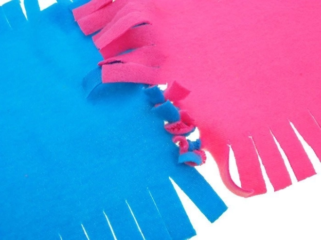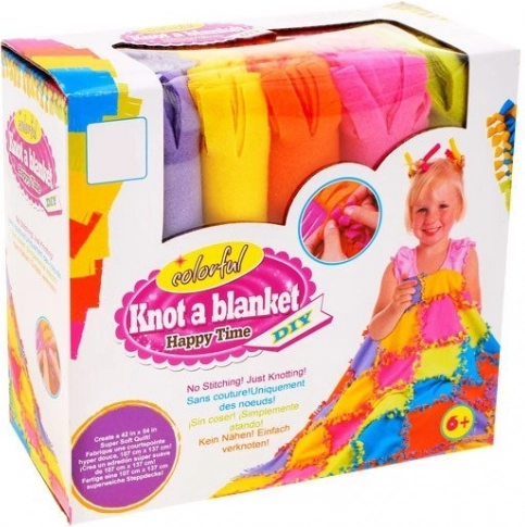 Ogni pezzo ha le frange pretagliate: basta annodare i quadrati tra loro e la coperta è pronta senza ago e filo. Ideale anche per principianti.