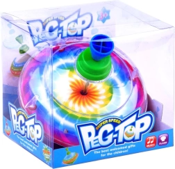 Giocattolo tradizionale in versione moderna: una trottola colorata che, quando gira, si illumina e riproduce allegra musica. Il semplice comando a pistone mette in rotazione la trottola sul proprio asse e, sotto la cupola trasparente, crea un incantevole effetto arcobaleno. Realizzazione in plastica resistente, ideale per sviluppare la motricità fine e la coordinazione.