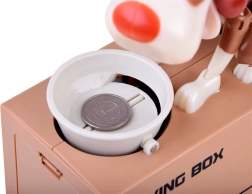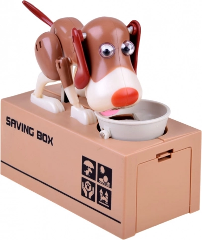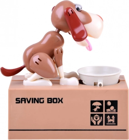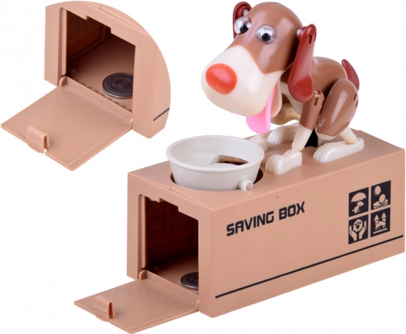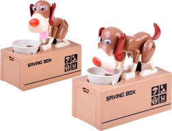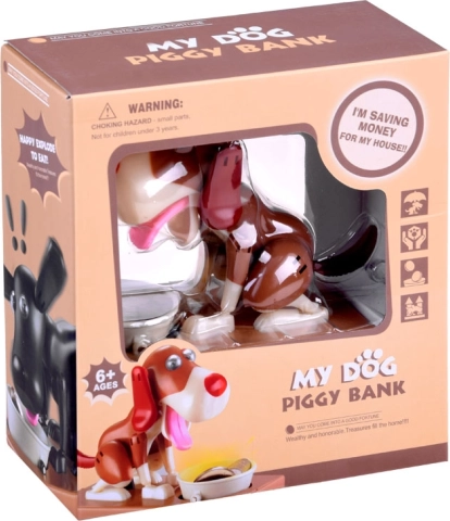 Inserisci una moneta nella ciotola davanti al cane. Il cane inizia a muoversi come se stesse mangiando, facendo cadere la moneta nel salvadanaio. Il cane si muove allegramente e scuote le orecchie. Richiede 3 batterie per funzionare. Il salvadanaio aiuta i bambini a capire che risparmiare non è solo divertente, ma porta anche risultati positivi.