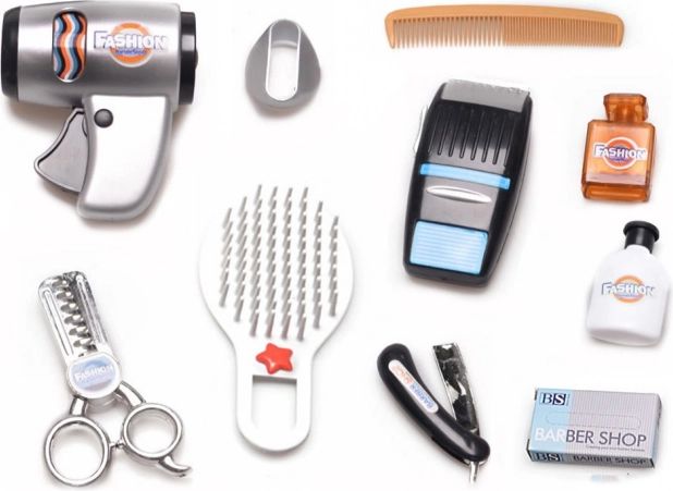 Il kit include tutti gli strumenti necessari per il gioco di fare il parrucchiere, dalle forbici da taglio alle bottiglie di shampoo e colonia.