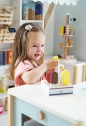 I colori tenui e le forme realistiche stimolano la percezione sensoriale, mentre inserire ed estrarre i ghiaccioli allena la coordinazione occhio–mano. Il set si abbina perfettamente al banco compatto FRESH, per creare una completa postazione gelato per ore di gioco creativo.