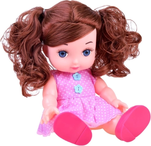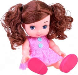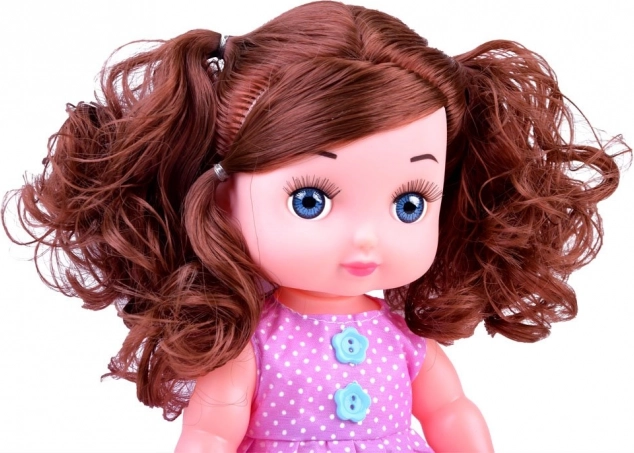 La bambola ha lunghi capelli ricci e occhi azzurri brillanti con ciglia, che le conferiscono un’espressione realistica e vivace.