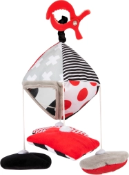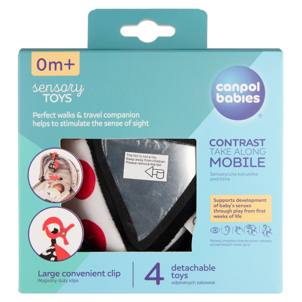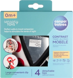 Il giocattolo sospeso a contrasto Canpol babies SENSORY è progettato per i più piccoli da 0+. L’alto contrasto dei colori (nero, bianco, rosso) favorisce lo sviluppo naturale della vista, mentre le diverse texture, i suoni e gli specchietti sicuri stimolano curiosità e concentrazione. Grazie al fissaggio semplice con clip, è perfetto a casa e in viaggio.