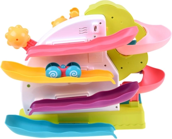 La pista interattiva 2in1 colpisce per i colori vivaci, le simpatiche figurine e gli effetti accattivanti. In modalità biglie, tirando la levetta con la testolina del leoncino, la biglia viene spostata al livello più alto e scende attraverso quattro piani, accompagnata da musica allegra con possibilità di regolazione del volume o di spegnimento completo. In modalità macchinina basta lasciare l’auto dall’alto e guardarla sfrecciare fino al traguardo.