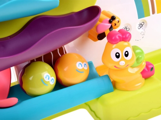 Una melodia allegra accompagna il percorso delle biglie. Il volume può essere regolato o il suono completamente disattivato: ideale per giocare a casa o in viaggio.