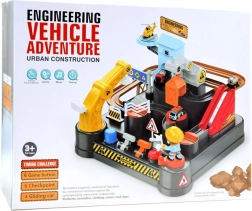 - Pista con ostacoli, gru con magnete, ascensore, 3 macchinine da cantiere, elicottero, mini-figura del costruttore, torre con orologio digitale