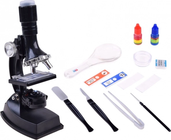 - microscopio, lente d’ingrandimento, ago, pinzetta, bisturi di sicurezza, spatola, piastra di Petri, 2× fiala con colorante, 2× preparato pronto, 2× vetrino portaoggetti vuoto, 5× coprivetrino, 5× etichetta vuota