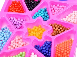 Le perline sono ordinate per colore in scomparti separati, permettendo una facile selezione e utilizzo.