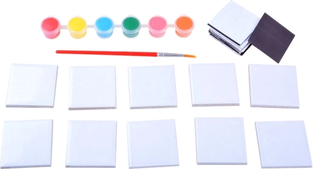 Il set contiene tutti i componenti necessari per creare dieci magneti - dalle piastrelle ai colori e al pennello. I bambini possono così immergersi immediatamente nell'attività creativa.