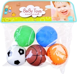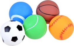 Questo set variegato include cinque palline di gomma colorate ispirate agli sport preferiti: calcio, basket, tennis, baseball e football americano. Grazie all’inserto fischiante integrato, quando si schiacciano emettono un suono divertente che stimola la curiosità dei bambini e sviluppa la motricità fine.