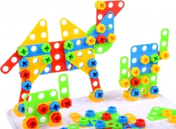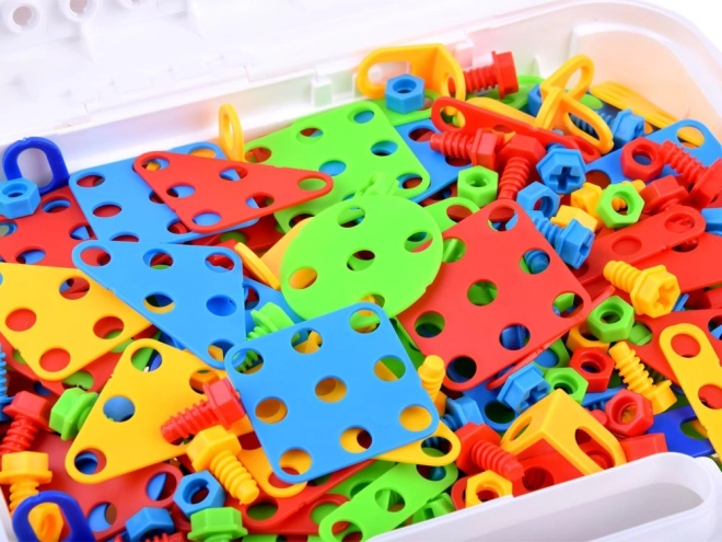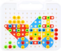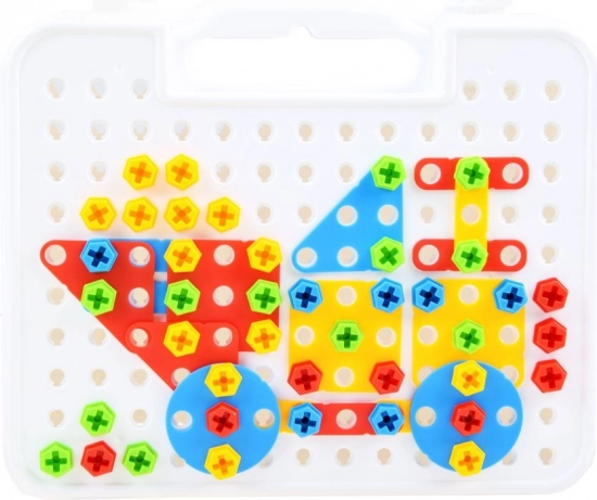 Questo set creativo per piccoli costruttori offre possibilità illimitate di costruzione. I bambini possono creare immagini 2D e modelli 3D usando la tavola perforata, le viti e i pezzi colorati di forme diverse. La valigetta con manico garantisce un facile trasporto e una sistemazione ordinata di tutti i componenti.