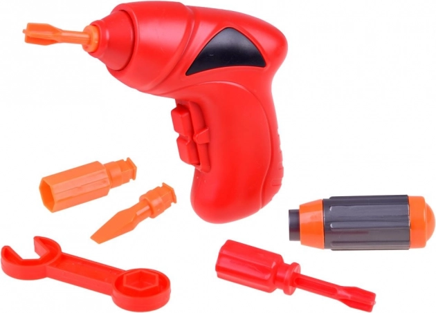 Trapano elettrico a 2× batterie AA, cacciavite e chiave permettono ai bambini di montare e smontare davvero i modelli, allenando motricità fine e autonomia.