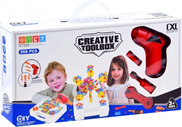 Sostieni la creatività dei bambini e la motricità fine con questo grande set di costruzioni in una pratica valigetta. Include 268 pezzi, forme colorate, viti e un trapano per bambini a batterie per un vero avvitamento. Ottima scelta per imparare giocando, sviluppare la logica e il pensiero spaziale.