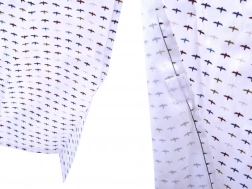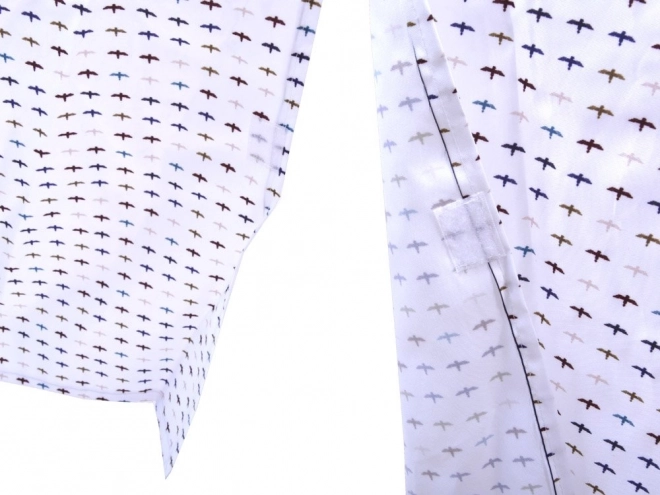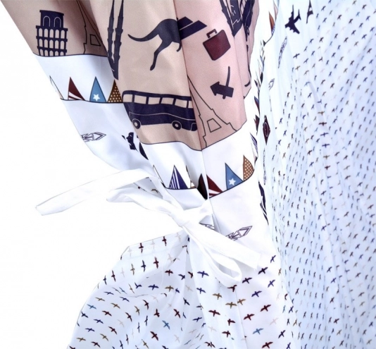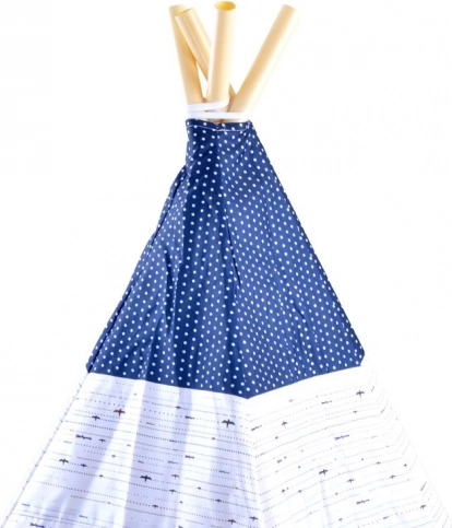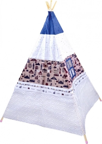 La tenda è progettata con una combinazione di motivi bianchi, blu e marroni che conferiscono un aspetto giocoso e attraente.