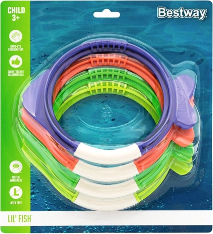 Scopri il mondo delle avventure acquatiche con il set di quattro pesci colorati BESTWAY per bambini dai 3 anni. Questi anelli da immersione a forma di pesce, nei colori giallo, blu, rosso e verde, affondano sul fondo dopo essere stati lanciati in acqua e motivano i bambini a tuffarsi e recuperarli. Sostengono le capacità di coordinazione, il miglioramento delle abilità di nuoto e la naturale gioia di muoversi in acqua. La confezione compatta facilita il trasporto e lo stoccaggio.