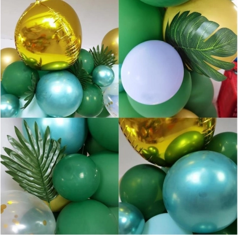 L’assemblaggio è semplice: gonfia i palloncini con aria o elio e fissali alla striscia forata. Disponi i palloncini più piccoli lungo il perimetro per un effetto pieno e stratificato. Le foglie tropicali e di palma aggiungono un tocco esotico e si abbinano perfettamente alla palette verde–oro.